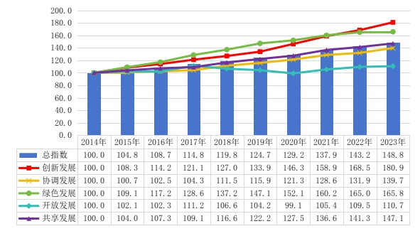 以2014年作为基期并设指数值为100,通过时序变化,观察创新发展、协调发展、绿色发展、开放发展和共享发展5个分领域指标值的变动趋势。分别计算创新发展、协调发展、绿色发展、开放发展和共享发展5个分指数,然后合成为京津冀区域发展总指数。对于部分统计起始年份晚于2014年的指标,使用开始统计的第一年数据对历史缺失值进行补充。