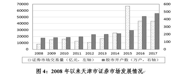 改革开放以来,天津在证券市场方面大胆探索。八十年代末九十年代初开始,天津证券业发展迅速,市场基础设施不断完善,法律法规逐步健全,市场规范化程度不断提高,为金融市场改革发展和经济结构调整做出了重要贡献。截止2017年末,天津共有证券经营机构179个、证券投资咨询公司1个、基金管理公司1个、期货经营机构38个。