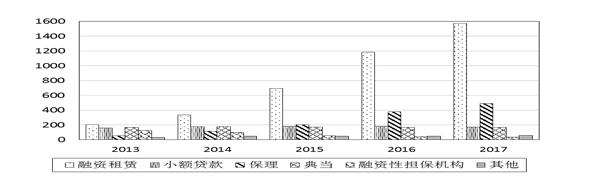 近十年来,尤其是党的十八大以来,天津充分利用政策优势先行先试,以融资租赁、消费金融、典当、小额贷款、保理和融资性担保公司等为代表的新型金融业态逐步发展起来,初步形成了门类齐全、覆盖广泛的金融机构服务体系,有效提高了金融服务实体经济的效率。如图5所示,截至2017年底,天津市共有新型金融机构2502家,是2013年的3.3倍,占全部金融机构总数的36.6%。其中:融资租赁公司由近200家,增长到2017年的1574家,增长了6.6倍;保理公司由近50家,增长到2017年的489家,增长了8.2倍。
