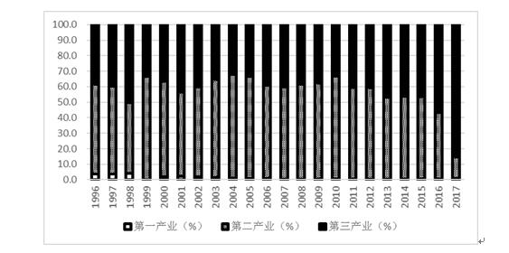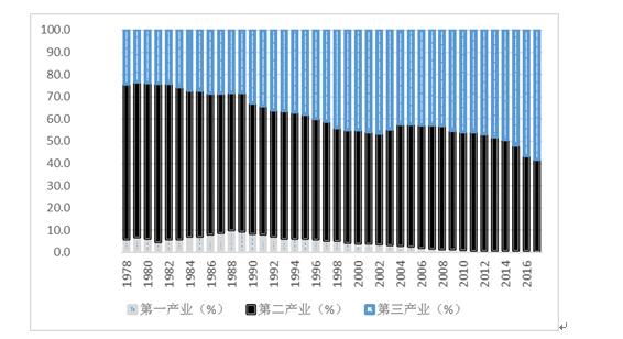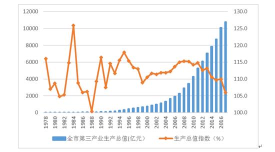 1978年以来,我市服务业逐渐开放,增加值保持增长;进入上世纪90年代,我市服务业开始进入快速发展阶段,规模迅速扩大,增加值增速基本保持两位数增长水平,对国民经济的贡献也不断加强,成为我市经济的重要组成部分;跨入新世纪,服务业开始发力,我市服务业增加值在保持快速增长的基础上,对全市GDP的拉动作用不断提升;特别是2013年以来,我市服务业增加值增速逐渐开始领跑,成为经济增长新动能,2015年服务业增加值首次超越第二产业,比重突破50%,2016年突破万亿元,贡献率突破50%。至2017年我市已经形成了“三、二、一”产业结构,服务业对GDP增长贡献率达到85.5%,在改革开放的大潮中,我市的经济结构发生巨变,转型升级后确立了服务业的主导地位。