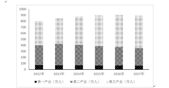 图6 2012-2017年天津市社会从业人员三次产业分布情况